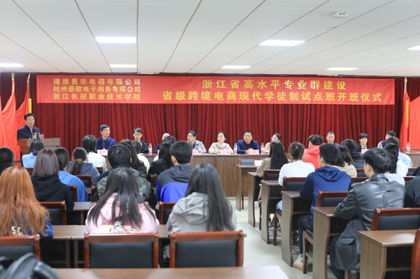 近日,我校在党员之家隆重举行了“长征·勇华跨境电商创星工作站”和“长征·豪歌跨境电商新星工作站”两个省级跨境电商现代学徒制试点班的开班仪式。学校副院长杜宝山、董事长助理陈澍,建德市商务局电商科科长陈华、跨境电商协会会长吕益民、跨境电商协会秘书长方敏、建德勇华电器有限公司总经理朱国强,杭州豪歌电子商务有限公司总经理许新出席了开班仪式。开班仪式由学校校企合作处处长张崇利主持,我校省级跨境电商现代学徒制试点班的师生代表参加了开班仪式。
