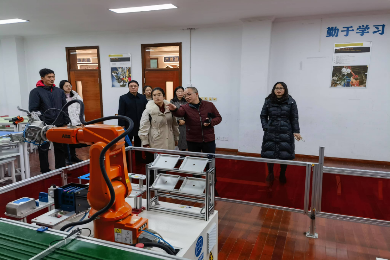 (参观智能技术学院磨抛工业机器人综合实训室,专任教师介绍校企协同开展人才培养评价工作情况)