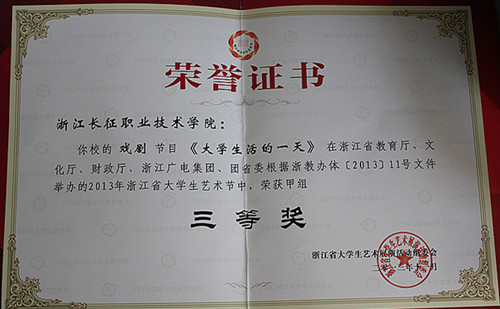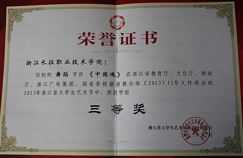 2013年11月学院艺术团选送的舞蹈《中国魂》和戏剧《大学生活的一天》分别获得由浙江省大学生艺术展演活动组委会承办的“2013年浙江省大学生艺术节”甲组三等奖。(院团委供稿)