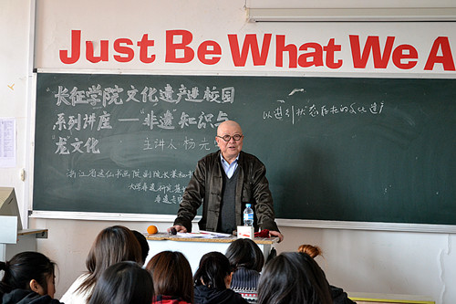 杨光宇老师首先介绍了非物质文化包括民间文学、民间艺术。民间音乐、民间舞蹈和民间杂技、戏曲等。接着杨老师为同学们讲解了龙的发展史,帮同学们纠正了一个错误的认知——龙是没有性别的。最后欣赏了许多龙的图片。