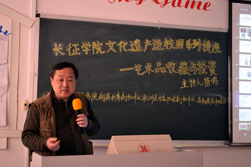 萧鸣老师就“收藏的多元化、哪些艺术品值得投资收藏”等几个方面进行演讲。萧老师结合个人经历的精彩演讲,激起了在座很多同学的热情,爱好收藏的同学更是积极的跟老师进行探讨,使得课上的气氛愈加热烈。